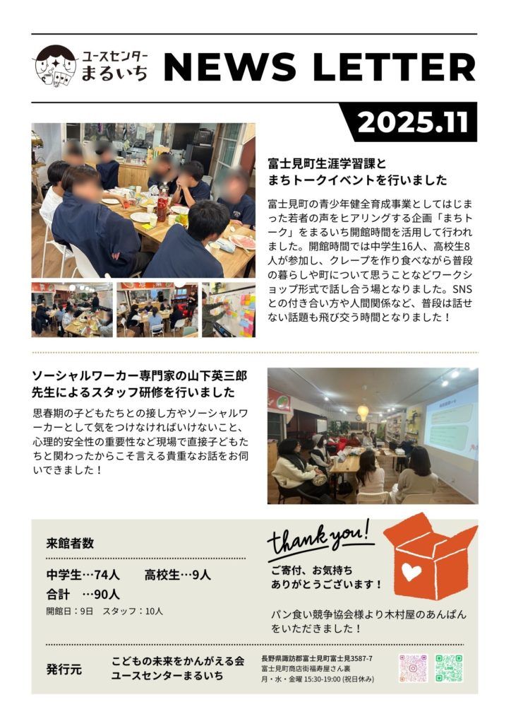 富士見駅から徒歩2分。富士見町商店街「福寿屋」奥に中高生が自由に過ごせる「ユースセンターまるいち」をオープンしています。