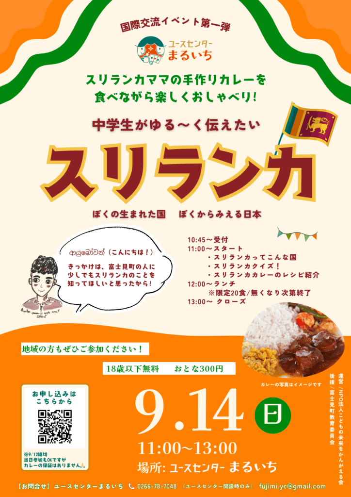富士見町のユースセンター・まるいちで、9月14日(日)に国際交流イベント「中学生がゆる~く伝えたいスリランカ」を開催します。